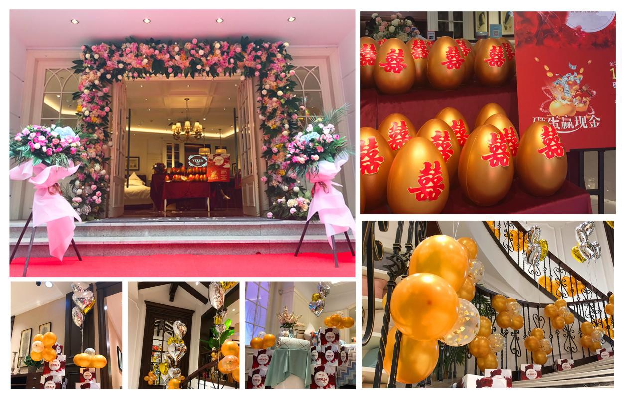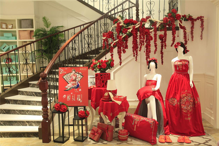 為帶給顧客更直觀舒適的消費體驗,在空間設計上,維科家紡和義店二樓婚慶家紡場景展示區(qū)摒棄了家紡行業(yè)傳統(tǒng)高柜+展床的方式,將300余平的空間分隔成7個實景樣板間,真實體現(xiàn)婚慶床品在日常家居生活中的效果,也能滿足顧客在選購婚慶床品的同時,一站式解決對婆婆禮、長輩禮以及婚慶小件(子孫桶、火銃、虎頭鞋等)的需求。由于該創(chuàng)意目前在家紡行業(yè)中應用較少,可借鑒之處寥寥無幾,公司各部門投入了大量的時間精力不斷對方案進行修改,力求盡善盡美。整個二樓還設置了一大一小兩個洽談區(qū),都配備了舒適的沙發(fā)以及精致的茶歇,以供顧客能夠坐下來向?qū)з徳敿毩私獯财返男畔?。在陳列布置上,當季新品醉紅妝、子孫滿堂、胭脂醉,熱銷品百子納福、麒麟賀滿堂等都被直接鋪設于房間內(nèi),并搭配生活化的情景道具,供顧客選購。
