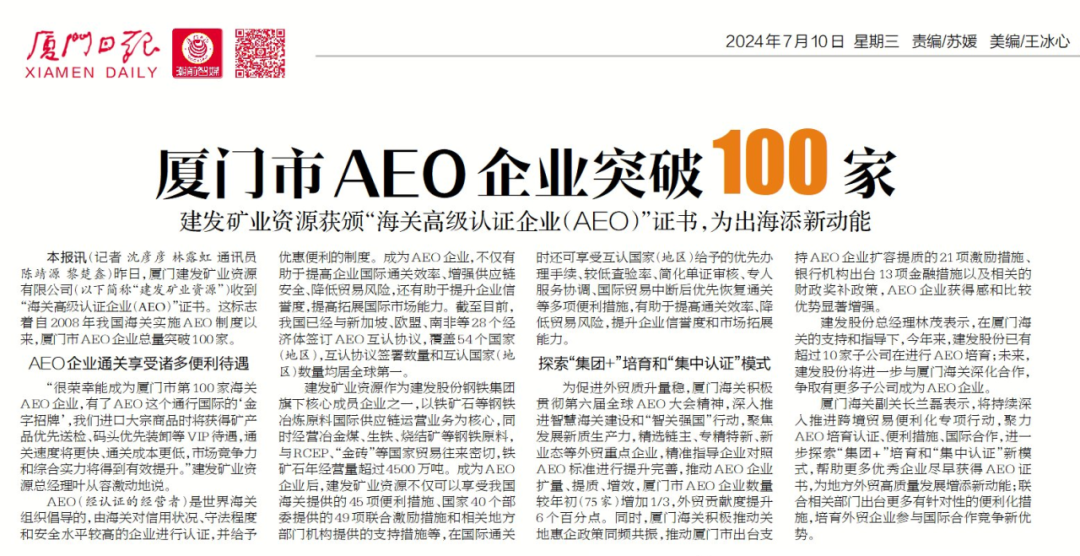 交融共贏開新局丨建發(fā)礦業(yè)資源獲頒成為廈門市第100家AEO高級認證企業(yè)